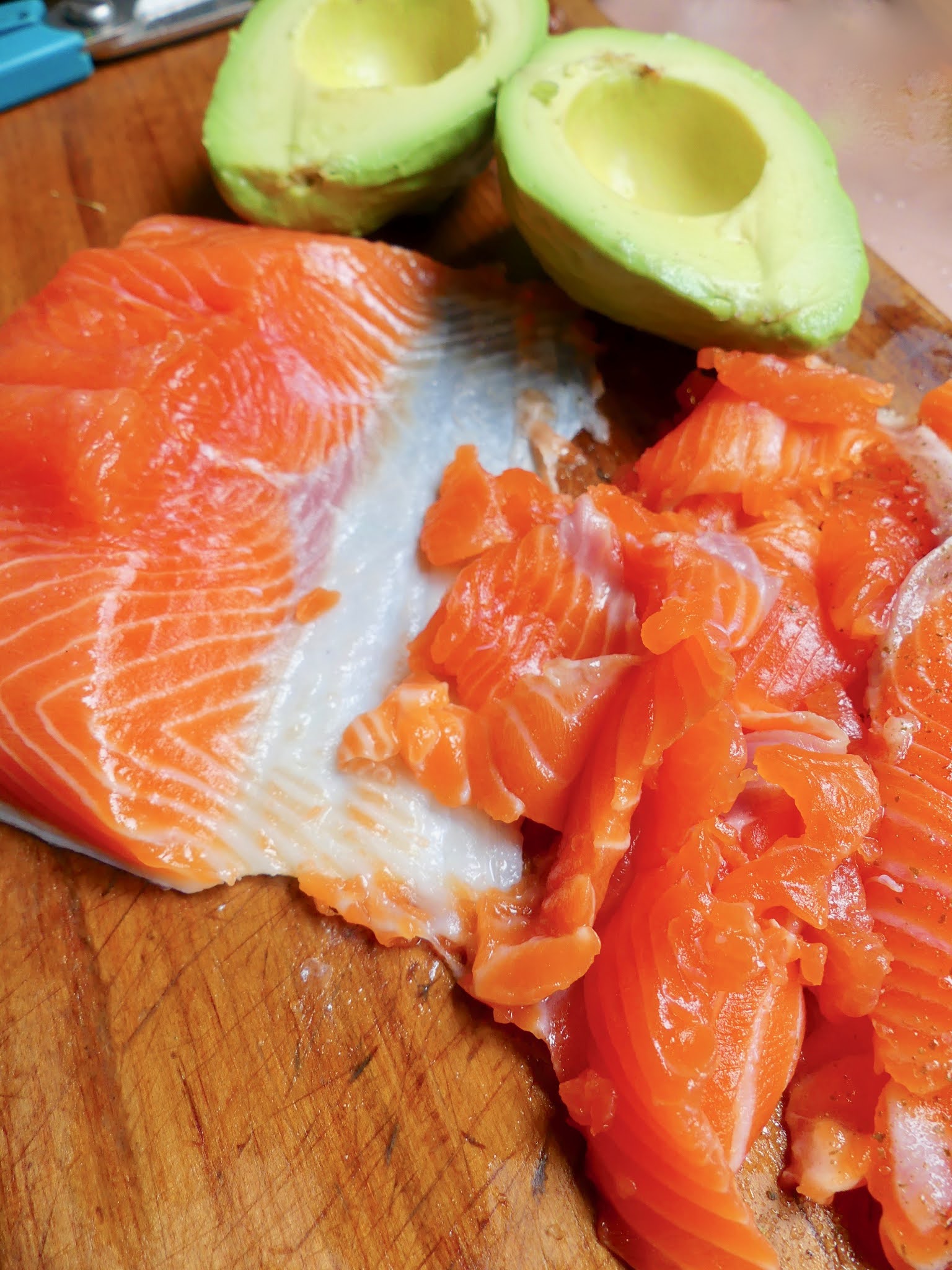 Then we added home made preserved ginger. It's so easy- learn how to make it just here.That's the salad part. Next add things like nori cut in strips or pickled seaweed like Neptune's Necklace. Avocado makes a nice contrast to the other textures and flavours. We bought a small pierce of lovely salmon and cut it finely to make sashimi (remove any bones as you go) sprinkle with sea salt. Toasted sesame seeds white or black are a lovely too. The rest- make up as you go along. Wasabi if you like it.